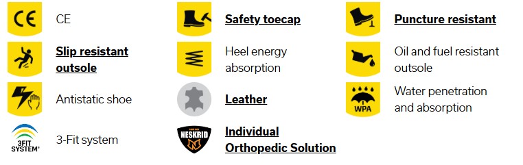 Deze schoen voldoet aan veiligheidsnorm S3 en beschikt over antistatische en waterafstotende eigenschappen, antislipprofiel, een anti-perforeerbare tussenzool, een energie-absorberende hiel en een stalen veiligheidsneus.
