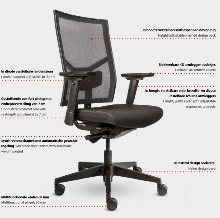 Comfortabel zitten gedurende een langere periode is nooit een probleem met de Ergo-Offiskan. Het Donati D109 mechaniek, de comfort zitting met stiknaden (zonder afdekkap) en 6 cm verstelbaarheid, de netbespannen rug en de in hoogte verstelbare en in breedte- en diepte instelbare schuine armleggers zorgen voor comfort bij een langdurige zitperiode. Deze bureaustoel is verder voorzien van een nylon zwart onderstel met een zwarte gaslift en multifunctionele wielen. De Ergo-Offiskan heeft standaard 15 jaar Full Service garantie.
