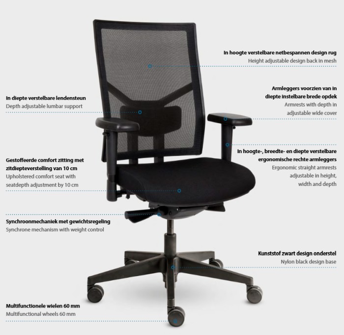 De ideale zitpositie vinden gaat zeker lukken met de Ergo-Offiskan NPR door een groter bereik en vele afstelmogelijkheden. Het Donati D109 mechaniek, de comfort zitting met stiknaden en 10 cm verstelbaarheid, de netbespannen rug en de in hoogte-, breedte- en diepte verstelbare ergonomische armleggers zorgen voor veel comfort bij een langdurige zitperiode. De bureaustoel is verder voorzien van een kunststof design onderstel met een zwarte gaslift en multifunctionele wielen. De Ergo-Offiskan NPR heeft standaard 15 jaar garantie.